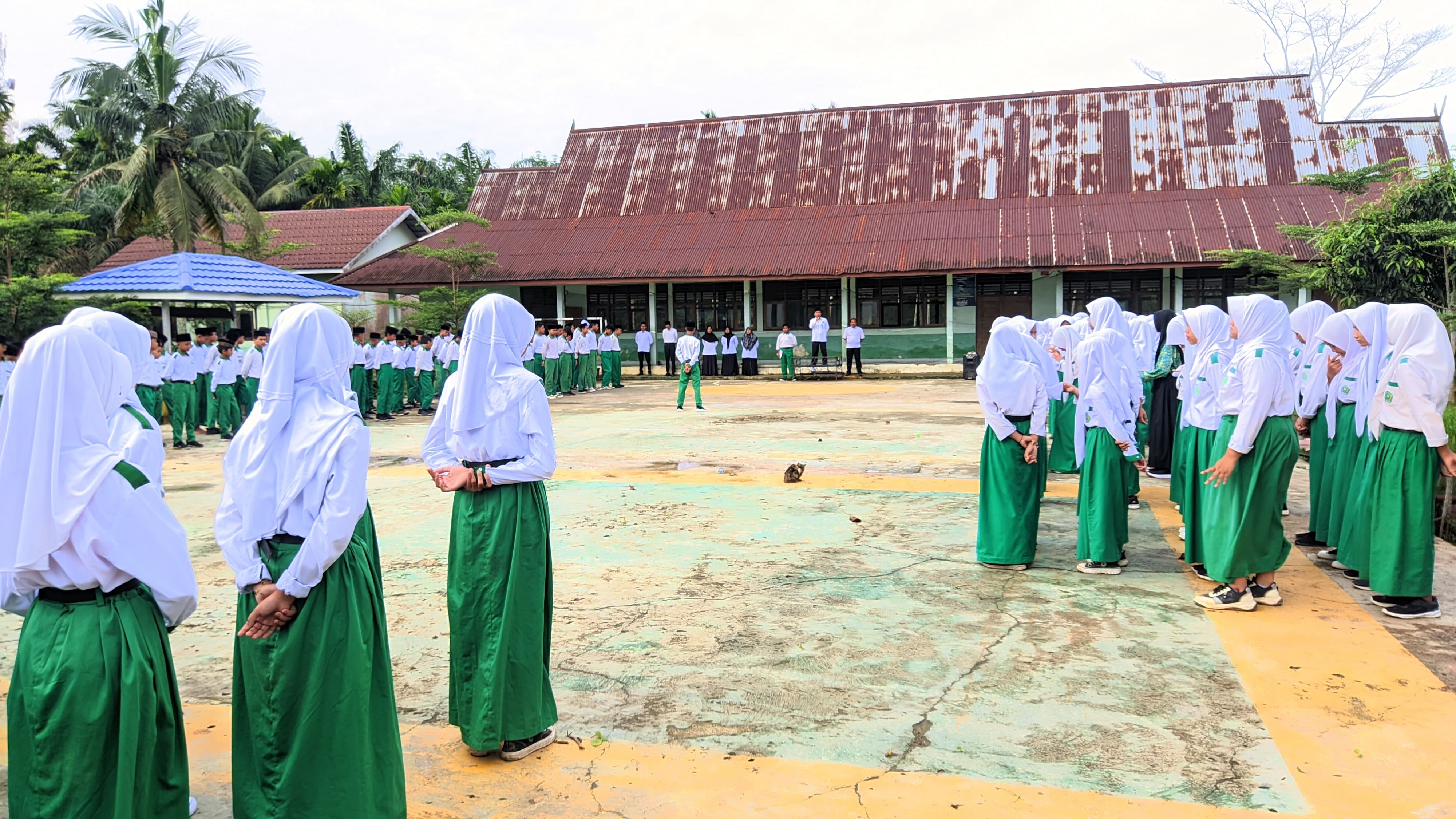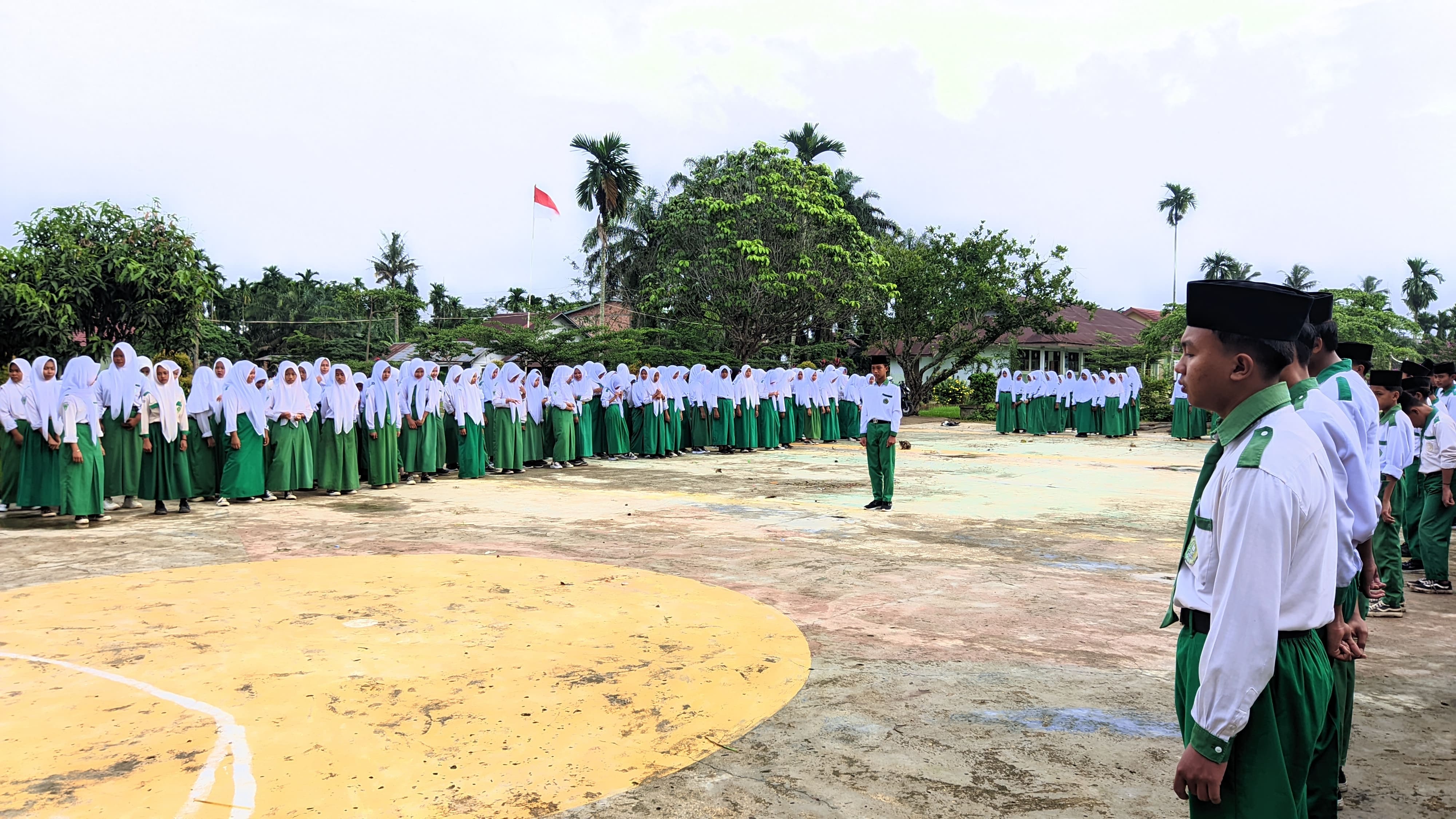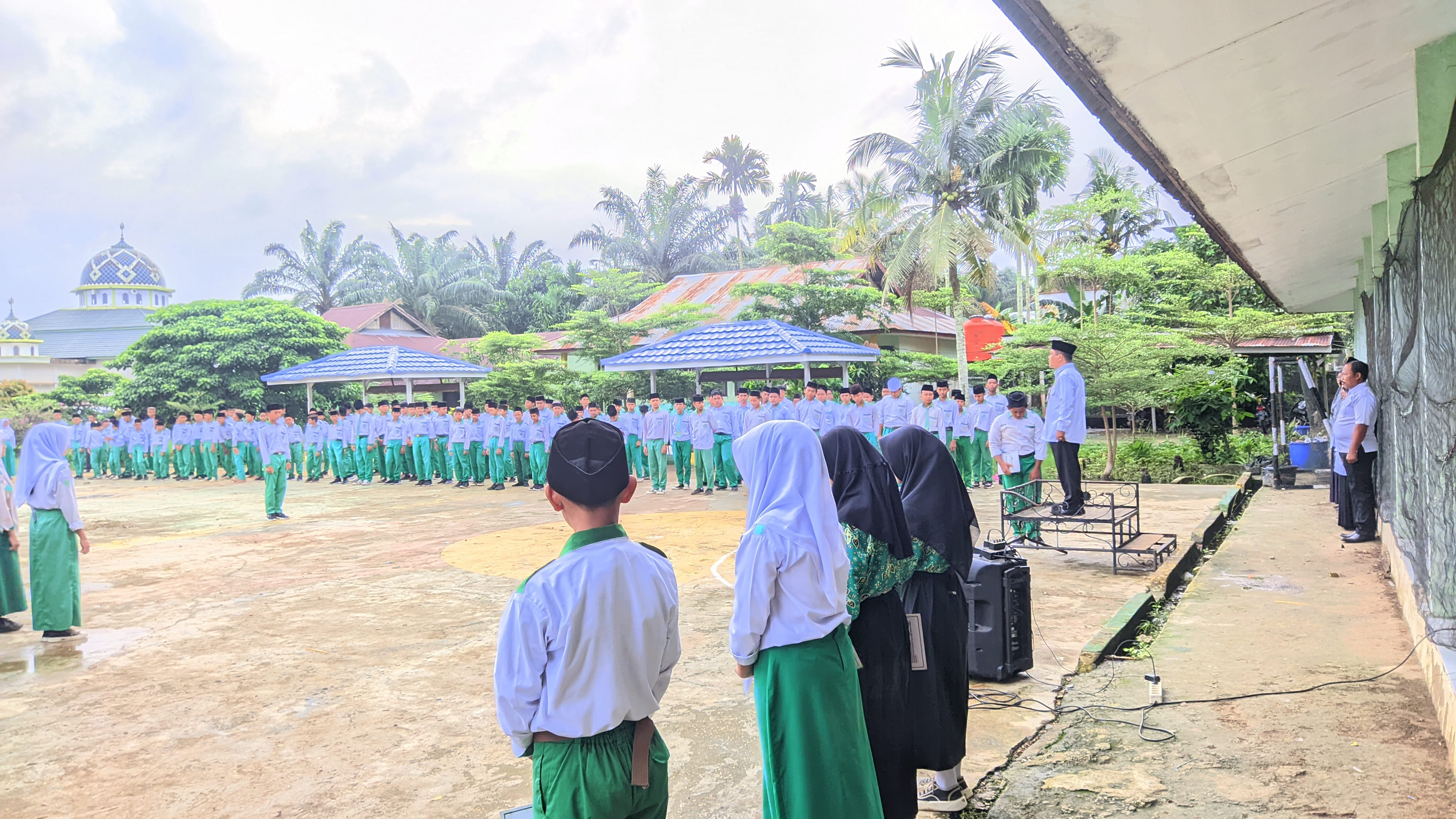 Tanjung Jabung Timur, MTsN 2 – Upacara bendera yang biasanya dilaksanakan setiap Senin pagi harus digantikan dengan apel pagi karena lapangan utama madrasah tergenang air akibat hujan lebat. Meski demikian, pelaksanaan apel tetap berlangsung dengan khidmat dan tertib.