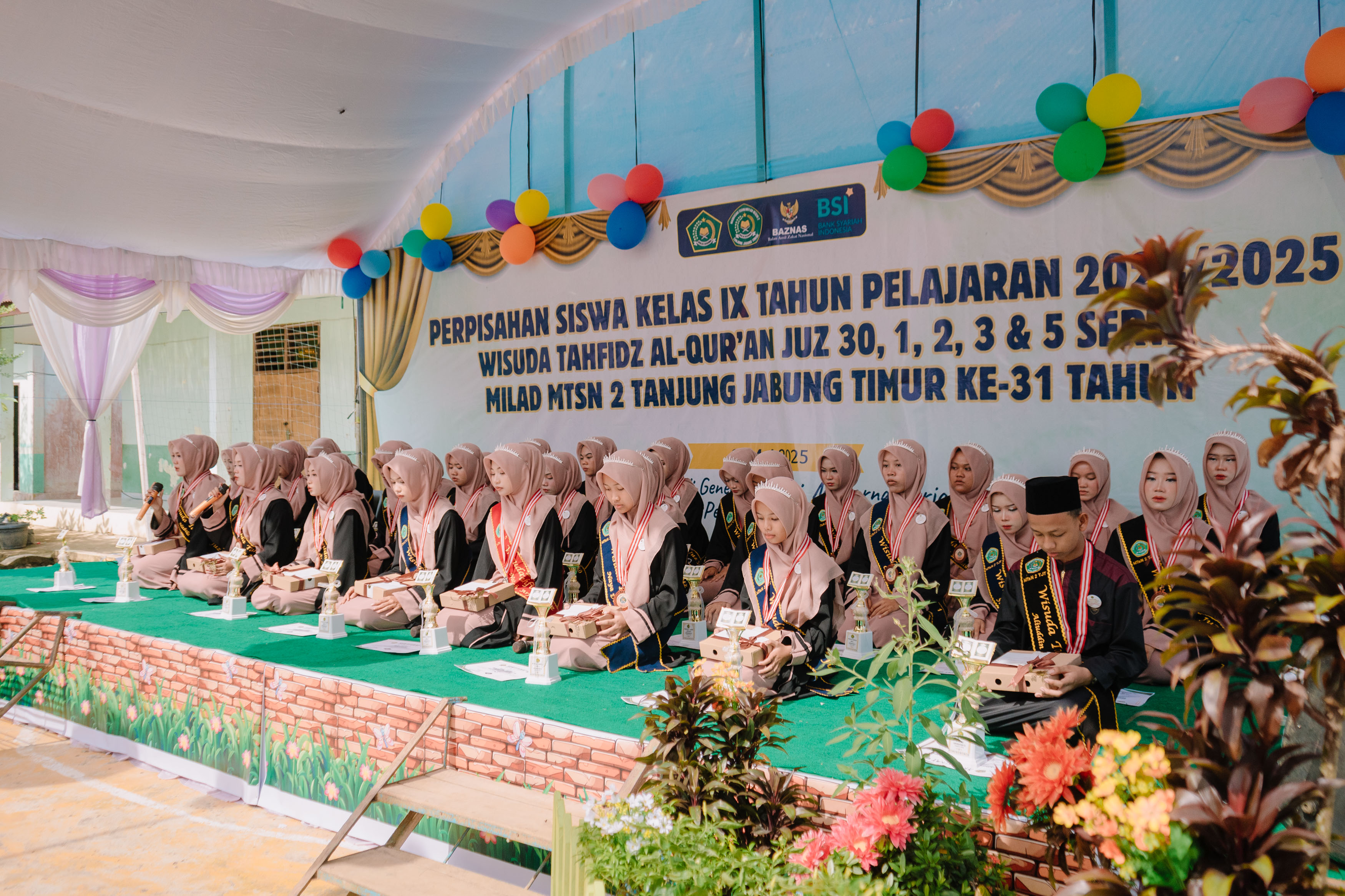 Acara ditutup dengan penyerahan piagam, penghargaan dari BAZNAS, dan doa bersama. Wisuda Tahfidz ini diharapkan menjadi motivasi bagi seluruh siswa MTsN 2 Tanjung Jabung Timur untuk terus mencintai, menghafal, dan mengamalkan Al-Qur’an sebagai pedoman hidup.